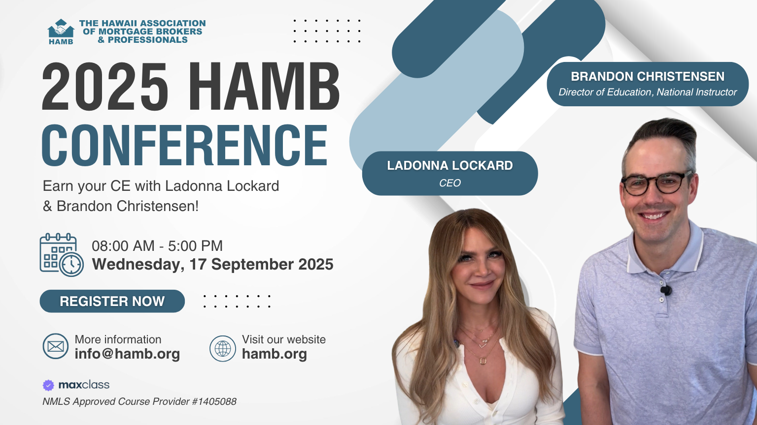 Join us for the Hawaii Association of Mortgage Brokers & Professionals (HAMB) 2025 Conference, an event that continues to serve as a cornerstone for professionals in the mortgage industry. This year, we’re proud to welcome LaDonna Lockard, CEO of MaxClass, and Brandon Christensen, Director of Education at MaxClass, as our featured CE Conference presenters and guest speakers.